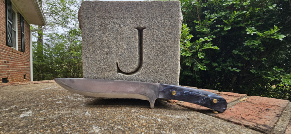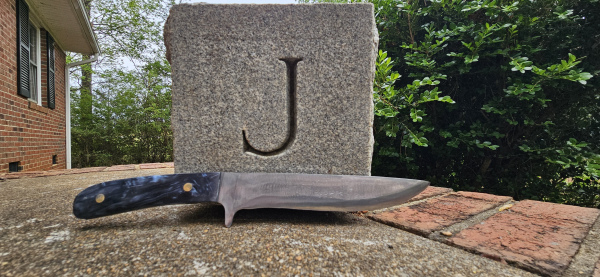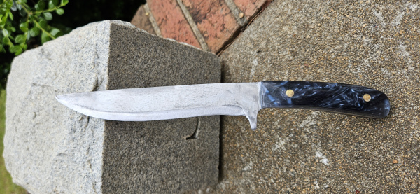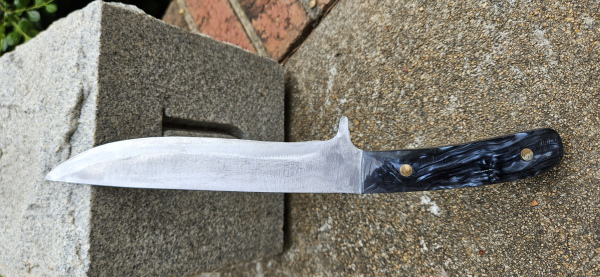 This is my first publicly available resin handled knife. It is made from a single piece of 1095 steel. I cut and added the brass pins for high contrast between the scales and the blade. The finger guard is rounded for comfort. This is not a small knife, it is a total of 10 & 1/2" long! The blade is 5 & 3/4" long and 1 & 1/8" wide. The handle is 4 & 3/4" long and 7/8" wide with a circumference of 3". As with all my blades, it will come exactly as pictured and sharpened. Thank you for looking!