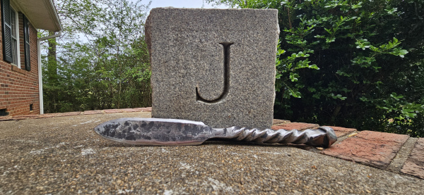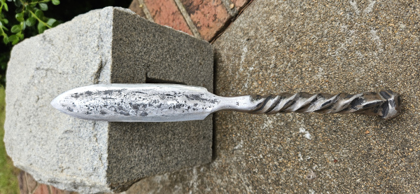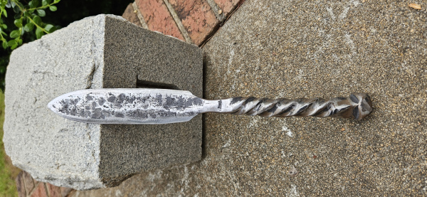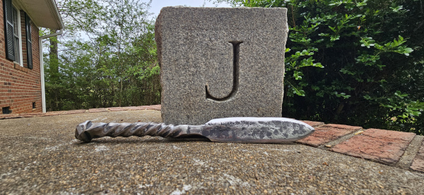 A chance to add this unique blade to your collection! This is a rather large knife at a full 1 foot! I made this from an 8 inch bolt from a burnt down shoe factory here in NC. It's double twisted handle along with the dual dimpled neck is amazing to see and hold. Please note that there are some small pits and cracks in it, not from the forging process but just from the age of the metal. I tested the knife and it appears to hold up well to normal to medium cutting. The blade is 5 & 1/4" long and 1 & 1/4" wide. The transition from the blade to the handle is 1 & 1/2" long. The handle is 5 & 1/4" long and 3/4" wide. As with all my blades, it will come exactly as pictured and sharpened. Thank you for looking!