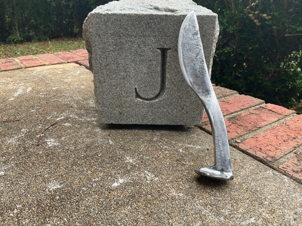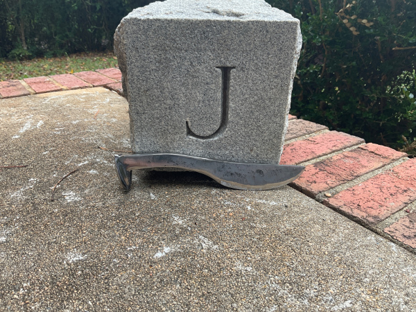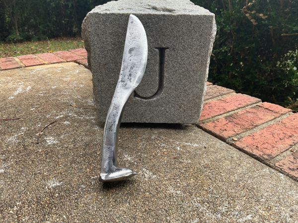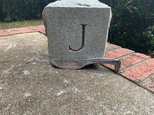 I decided to create a different kind of railroad spike knife. No twist, but an awesome curve in the handle and shinned up while still portraying it's antique look and forge marks. The overall length of the knife is 8 inches long. The blade is 4 & 1/4" long and 1 & 1/8" wide. The handle is 3 & 3/4" long and 5/8" wide. As always, it will come sharpened and exactly as pictured. Thank you for looking!
