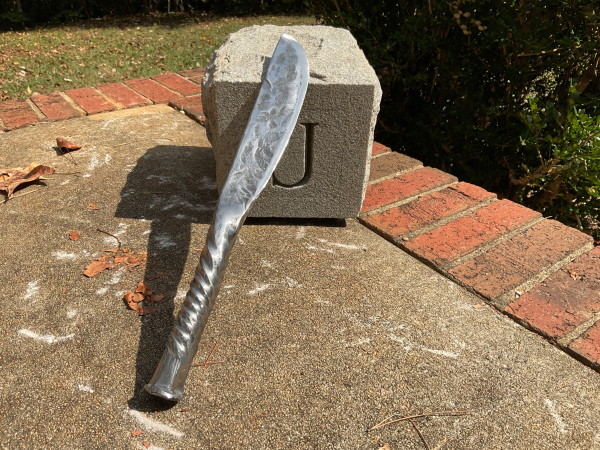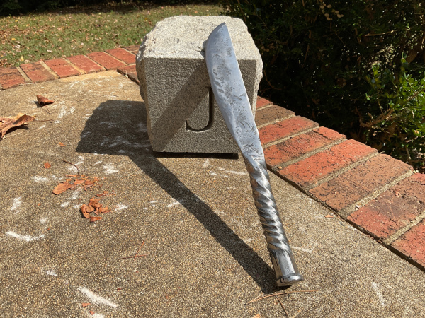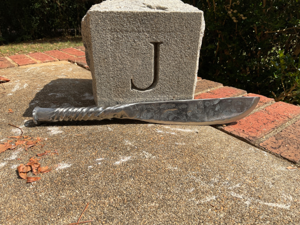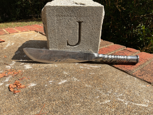 This knife is a beast! I made it from an Enderes A13 chisel. The handle has a tight twist that transitions to a more flowing twist. I also started the twist 1" from the head of the chisel to show what it was made from. The overall length of the knife is 14 & 1/4". The blade is 7 & 1/4" long and 1 & 3/4" wide. The handle is 7" long and 1" wide. As with all my knives, it will come sharpened and exactly as pictured. Thank you for looking!