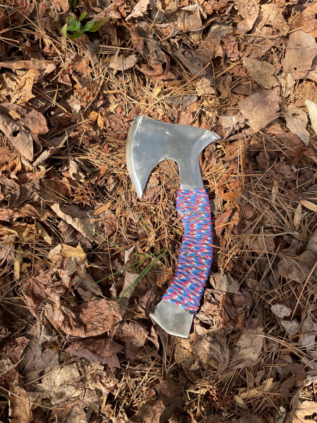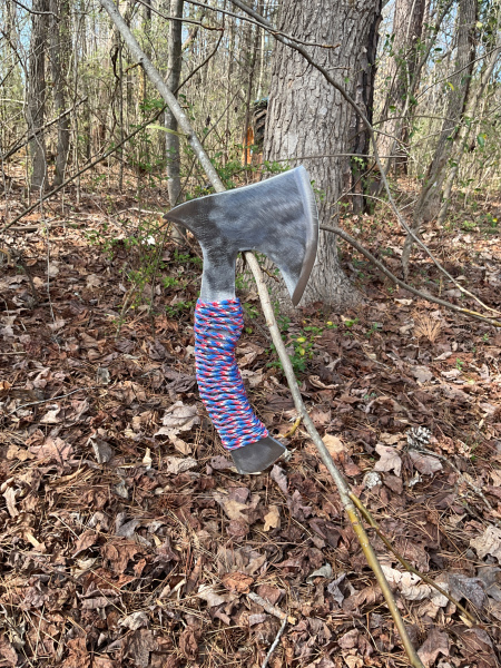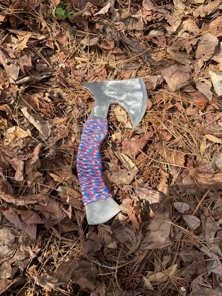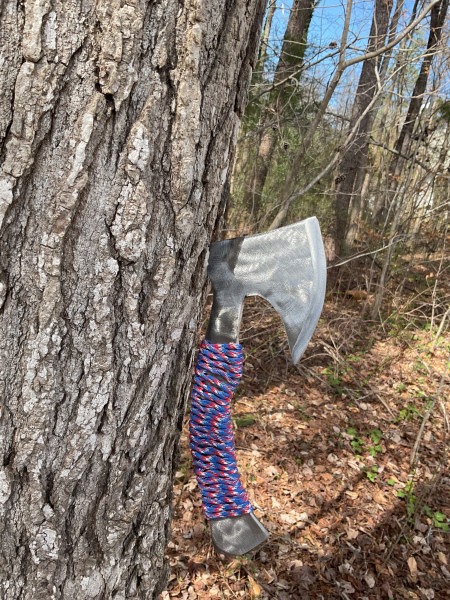 This axe would be great for camping, chopping wood, hunting, etc. I made it from a single piece of 1/4" thick piece of A36 steel. As you can see, I also added 550 cord to the handle for added grip and comfort. I also gave it an additional cutting surface for smaller items with the curvature of the rear face. The overall length of the axe is 10 & 3/4 inches. The head is 5" long and 4 & 3/4 inches wide. The handle is 7 & 1/2 inches long from the start of the 550 cord to the end and 1 & 1/2" wide. As always, it will come sharpened and exactly as pictured. Thank you for looking!
